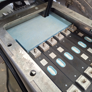 Below are photos of the progress of fitting in the rubber to protect the batteries from contact with the box. Fitting the batteries into position and installing a block to support the top row of batteries over the bottom row.